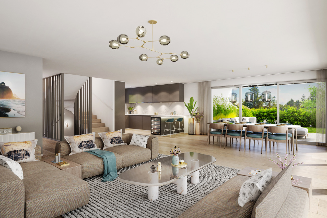 "Les Atoles" is an exclusive project of two high-end contemporary villas, ideally located in the highly sought-after town of Coppet, in the Terre Sainte region. In the immediate vicinity of Lake Geneva, the villas offer a rare living environment, combining serenity and convenience. The train station and the charming town of Coppet are within walking distance, while renowned international schools are just minutes away. These semi-detached villas are distinguished by their elegant architecture with clean lines, their large bay windows providing exceptional natural light, and their high-end amenities. Their location has been carefully designed to guarantee complete privacy for future residents. Minergie certified, they incorporate a geothermal heat pump with geocooling as well as photovoltaic panels. Each villa offers approximately 229 sqm of living space on a 675.5 sqm plot, with a flexible layout currently comprising four bedrooms, each with an en-suite bathroom. The basement