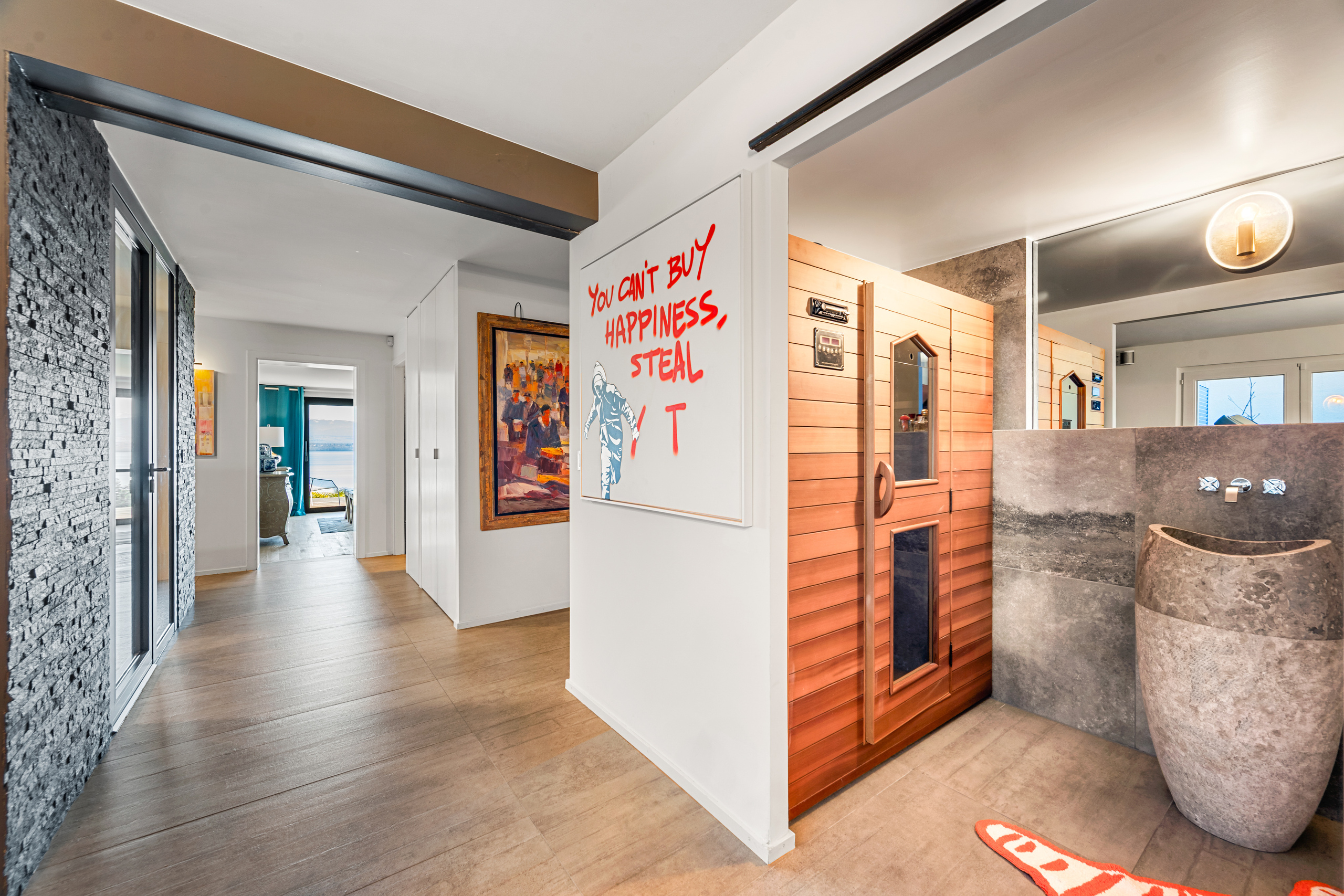 Nichée dans un environnement résidentiel privilégié à Crans, au cœur de la très prisée Terre Sainte, cette élégante propriété contemporaine bénéficie d’un emplacement d’exception à 20 min de Genève. Elle profite d’une vue panoramique sur le lac Léman, le port de Crans et le Mont-Blanc. Son emplacement est idéal à proximité immédiate des rives du lac et des écoles internationales les plus prestigieuses. Entièrement rénovée avec soin, la maison se distingue par son architecture moderne et ses lignes épurées. Chaque élément a été sélectionné avec un niveau de qualité optimal : matériaux nobles, aménagements sur mesure, équipements de haute qualité et finitions haut de gamme. Les volumes généreux et les vastes pièces de réception baignées de lumière naturelle créent une atmosphère lumineuse et chaleureuse qui sublime le confort et la qualité de vie au quotidien. Les pièces de vie sont ouvertes sur de larges terrasses