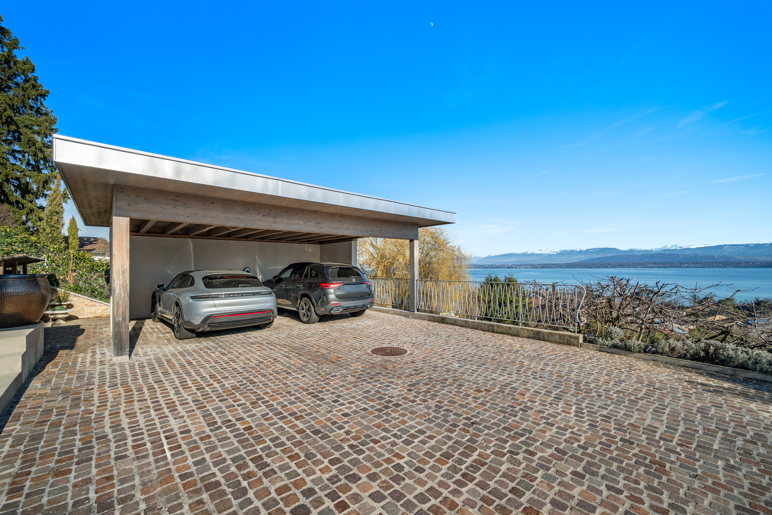 Un garage double, un couvert à voitures ainsi que plusieurs places de stationnement complètent ce bien d’exception rare sur le marché et parfaitement adapté aux besoins d’une famille.