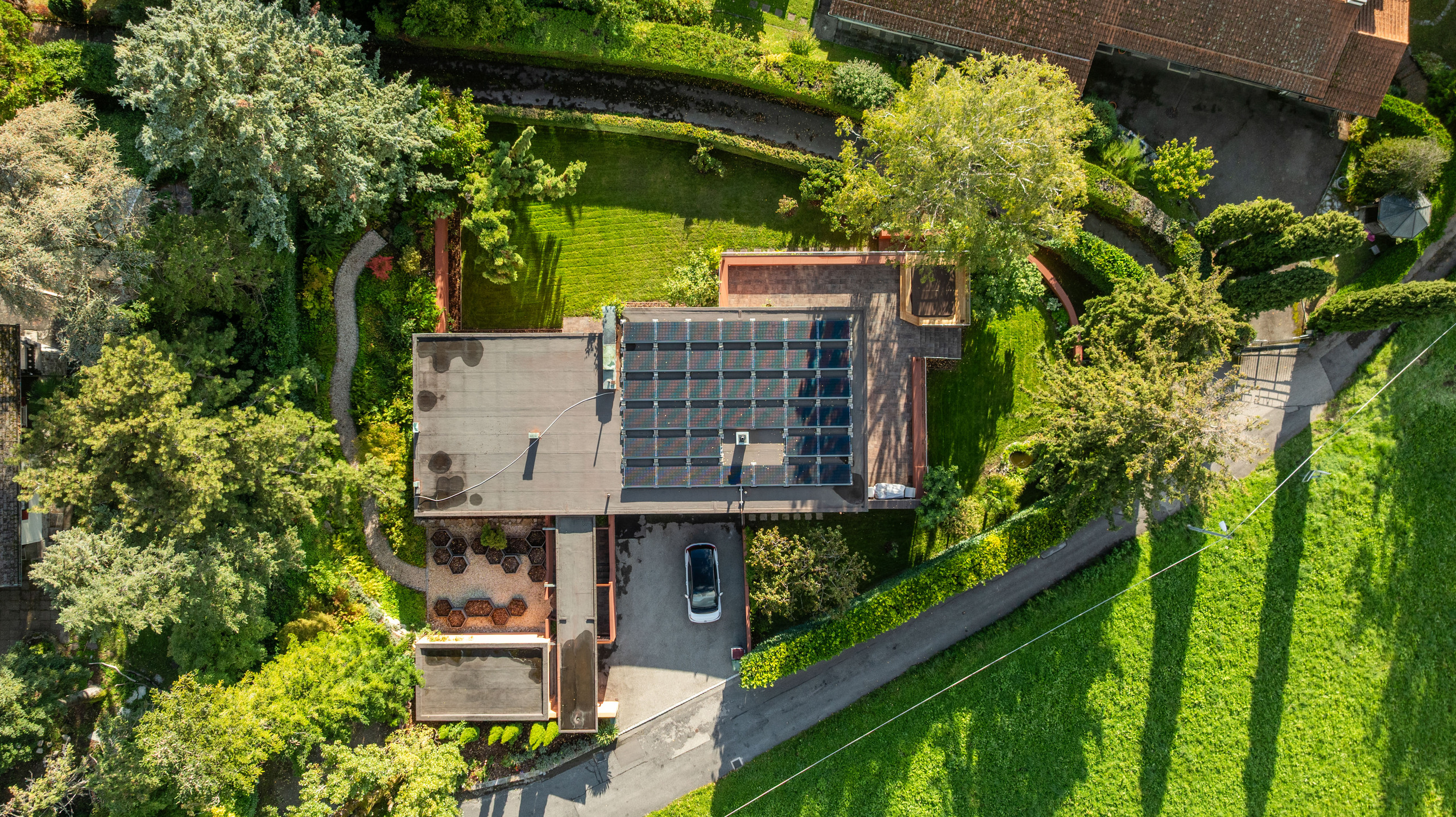 Un garage double équipé d’une borne de recharge électrique ainsi que plusieurs places de stationnement extérieures complètent ce bien d’exception.