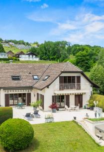 Overlooking the Lake Geneva basin and set in a verdant setting, this property subtly and charmingly blends traditional architecture with amenities designed for peaceful family living. Offering breathtaking views of the Alps and lake, it will appeal to lovers of serenity and exceptional panoramas. Come and discover this superb property with approx. 270 sqm of living space, comprising on the first floor a vast, luminous living room, a sublime lounge with its warm atmosphere, and a fully fitted and equipped independent kitchen. On the 1st floor, two bedrooms offer comfort and privacy, complemented by a bathroom and separate toilet, as well as a generous master bedroom with en suite bathroom. The basement features an independent studio, ideal for guests or professional use, as well as a boiler room, cellar, workshop and large double garage. Outside, a 1326 sqm plot of land and a large terrace open onto